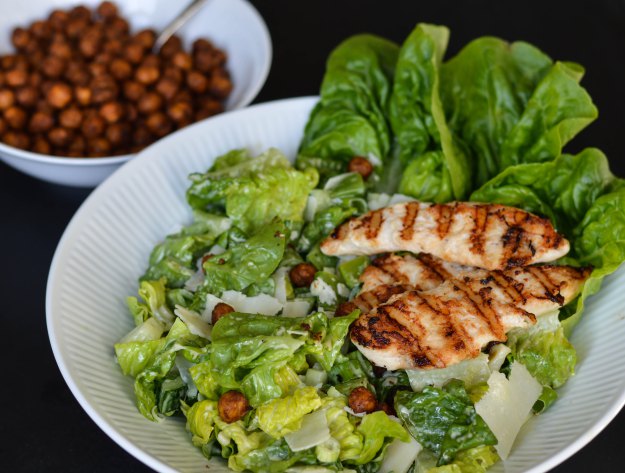Quite often I like a light salad for dinner and caesar salad is simple, yet so good. I always make the dressing myself – it is really easy to make and much better than the one you buy at your grocery store. Instead of adding croutons I chose a slightly more “low carb” version by making crispy chickpeas – and make sure to make a big portion – you might get addicted!